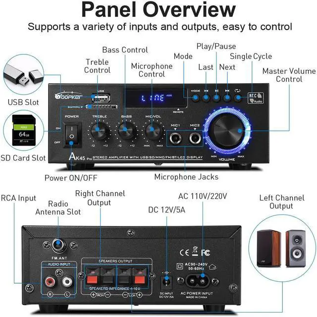 With Stereo 50Wx2 Rated Power Class D Amplifier, it can easily drive a wide range of speakers with 6-8 inches and 4-16 ohm impedance. Supports DC 12V/5A or AC 100-240V power supply, can be used worldwide.
