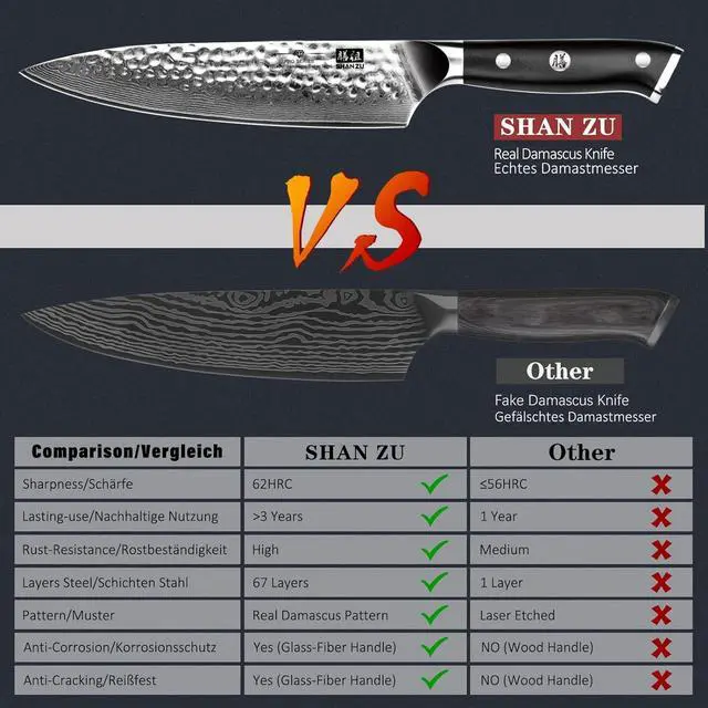 • REAL Damascus Knife, not Lazer EtchedDamascus knife is famous for its beautiful pattern, SHAN ZU Damascus pattern technique involves layering sheets of carbon steel, and applying excessive heat treatments with repeated folding and forging until the blade pattern is formed.