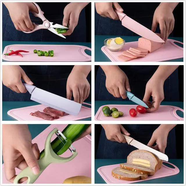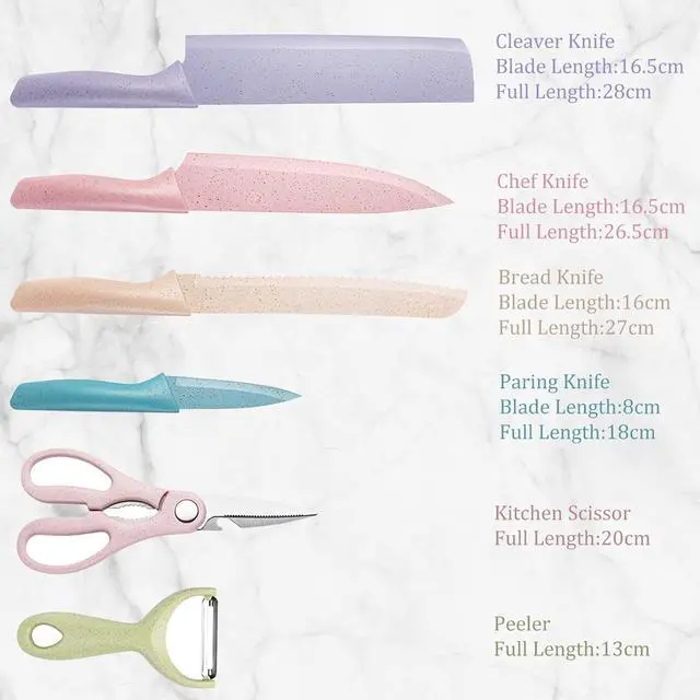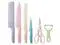 This 6-piece colorful kitchen knife set includes sharp stainless steel knives with ergonomic non-slip handles for safe, comfortable cutting. The set comes with a cleaver, chef knife, bread knife, paring knife, scissors, and peeler, ideal for slicing meat, chopping vegetables, cutting bread, and prepping fruit. The pastel color-coded design keeps your kitchen organized and helps prevent cross-contamination. Lightweight, durable, and easy to clean, this set is perfect for home cooks, students, apartments, and RV kitchens. A practical, modern set that upgrades any kitchen. Includes: Cleaver, chef knife, bread knife, paring knife, scissors, peeler | Blade: Stainless steel | Handle: Non-slip ergonomic | Design: Color-coded pastel | Use: Meat, vegetables, fruit, bread, daily meal prep.