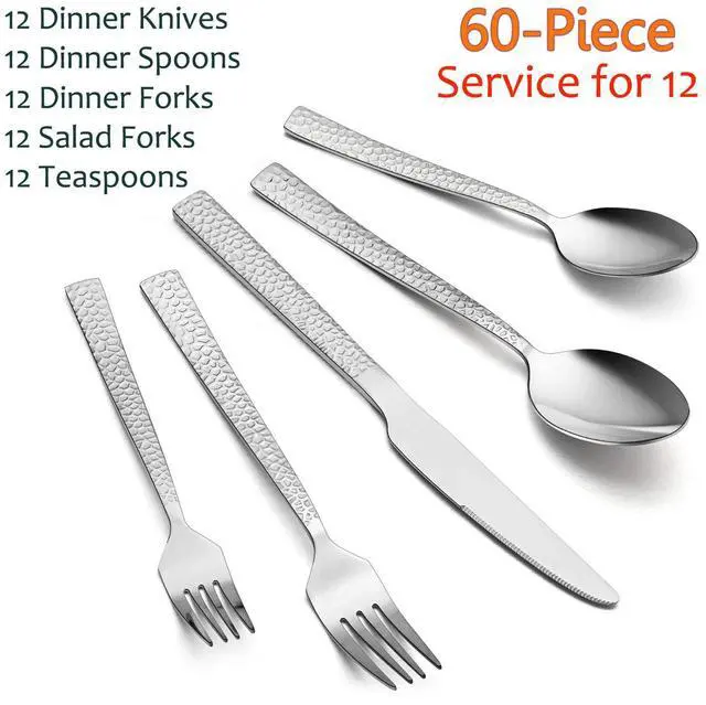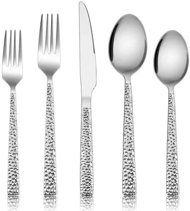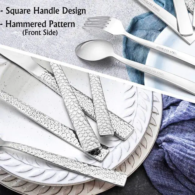 - MODERN STYLE - Stylish hammered design on the front side of each square handles, Mirror finish always keep shiny, Elegant flatware complements most tableware