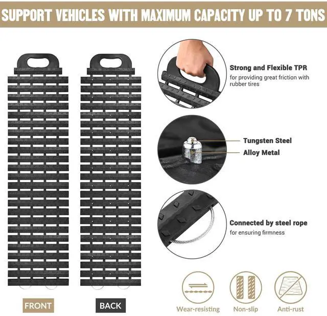 - Durable & Sturdy - Made of flexible TPR material with convex non-slip texture and connected by steel rope, the mats provide strong friction while contacting with rubber tires, ensuring frequent and prolong usage; Heavy-duty studs are constructed of wear & rust resistant alloy metal and tungsten steel for inserting into ice or hard soil to provide a firm base for recovery