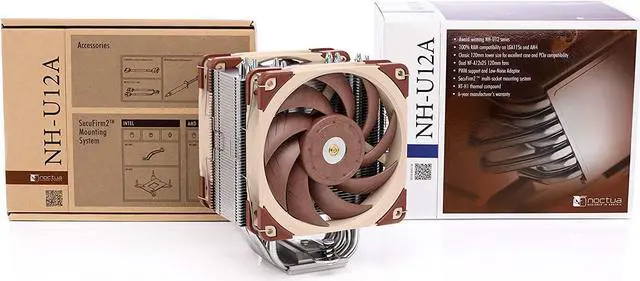 The NH-U12A is the latest, 5th generation of Noctuas NH-U12 series of 120mm size premium-quality quiet CPU coolers. Conceived to push the envelope of the 120mm form factor, it combines two of Noctuas flagship model NF-A12x25 PWM 120mm fans with a completely redesigned heatsink featuring 7 heatpipes and an increased fin surface area for superior heat dissipation. This way, the NH-U12A can rival the performance of many 140mm size coolers while offering 120mm class case and PCIe compatibility. Topped off with the trusted, pro-grade SecuFirm2 multi-socket mounting system and Noctuas proven NT-H1 thermal compound, the NH-U12A is a deluxe choice that combines top-tier performance with excellent compatibility and outstanding quietness of operation.