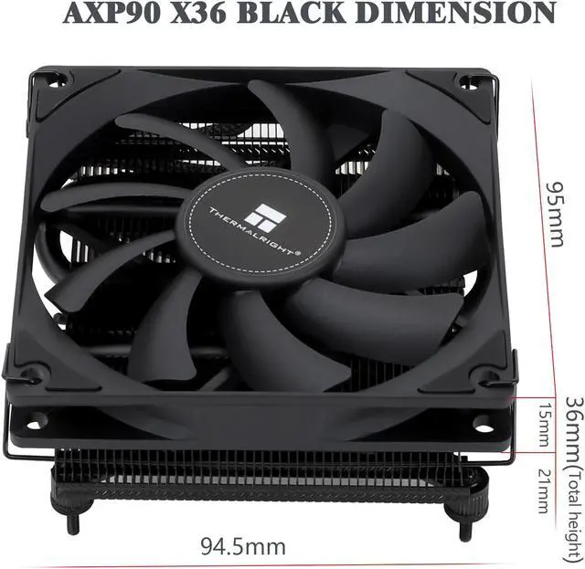 Parameters: Model: AXP90 X36 Black Size: 94.5 ×95×36mm Fan: 92×92×15mm Air volume: 42.58CFM (MAX) Air pressure: 1.33 mmH2O (MAX) Speed: 2700RPM±10% Noise: 22.4 db (A) Fan pin: 4PIN PWM