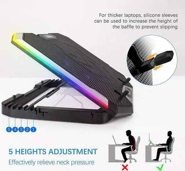 The base and shell of thermosetting plastic have better texture and are stronger at the same time. Laptop cooler is compatible with 11-17.3 inch laptop. The two USB ports are reinforced and matched with the braided wire USB cable, which will not fall off and loose easily. The 2 silicone sleeves are used to heighten the anti-skid buckle, which is suitable for large and heavy laptop.
