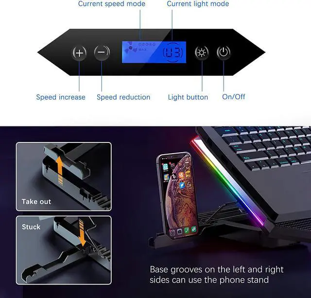 5 kinds of adjustable height to choose. you can adjust the suitable angle to effectively relieve the fatigue of the cervical spine and neck according to your needs. The phone holder is stored on the left side of the laptop cooler base, you can expand it and place your phone to view information easily.