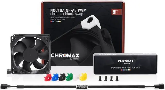 Having received dozens of awards and recommendations from international hardware websites and magazines, the NF-A8 has established itself as a default choice when it comes to premium-quality 80mm fans. The chromax. black. swap edition combines the NF-A8s signature quiet cooling performance with an attractive all-black design and a bundle of swappable red, white, blue, green, yellow and black anti-vibration pads that allow the colour-customisation of the fan to match individual build colour schemes. For further customisation, a wide range of accessories such as coloured cables and anti-vibration mounts are available separately.