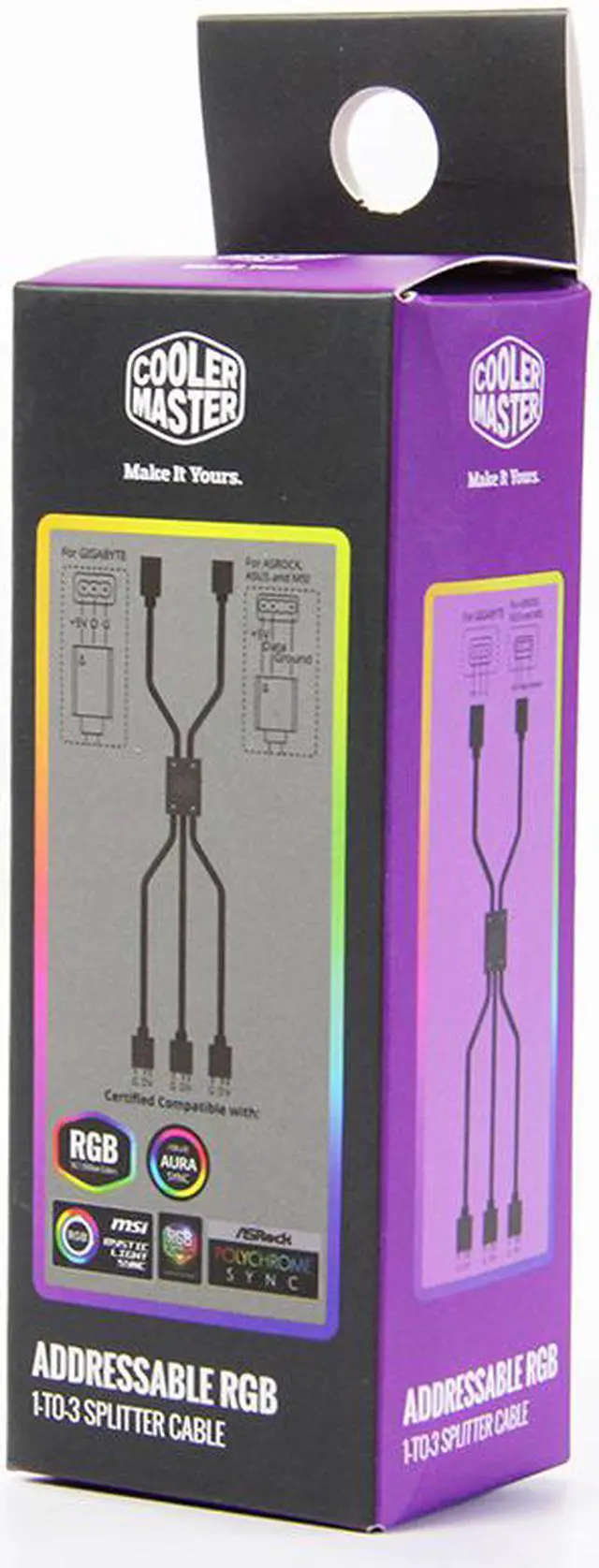 Cooler Master 1-to-3 ARGB Splitter Cable This 1-to-3 ARGB Splitter Cables allow users to connect three RGB LED fans and strips through a single motherboard RGB pin header, offering expandability and flexibility needed to build up aesthetically beautiful lighting systems. With standard 3-pin RGB header that is also capable of connecting 3-pin header without extra adapters. With its length of 30 cm, you can get the lighting that you want with none of the hassle. You can also daisy-chain multiple splitters, so possibilities are endless.