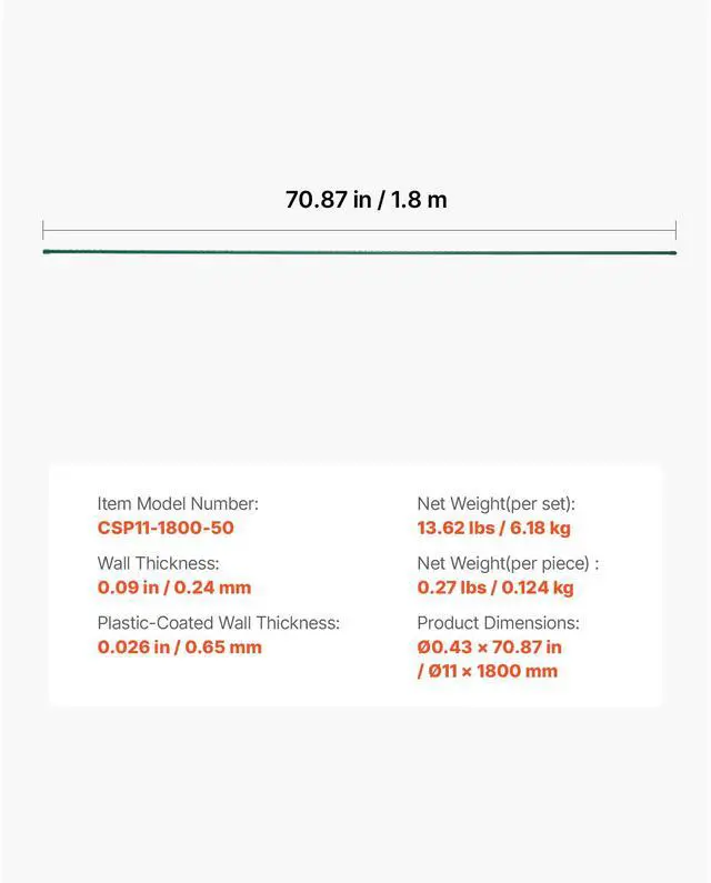 Product Dimensions: Ø 0.43 x 70.87 in/Ø11 x 1800 mm
