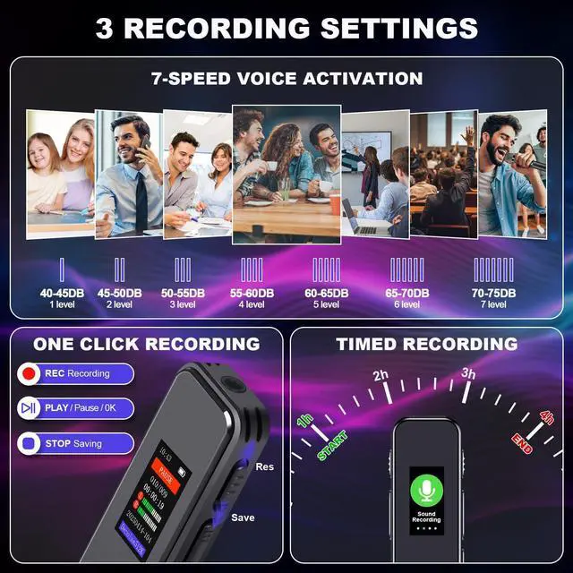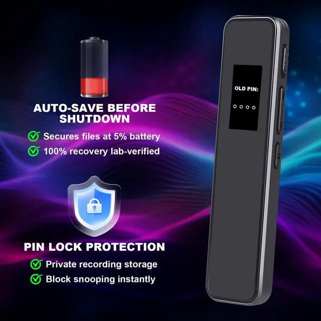 Multi-functional:Our audio sound recorder supports password protection, ensuring that your confidential recordings remain private and secure. supports Line-in input support, allowing direct recording from other audio devices. Supports variable Play Speed, A-B repeat, mp3 player, screensaver, playback, one-click delete etc.