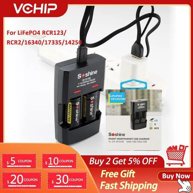 Soshine 16340 CR123 chargeur de batterie pour CR2 15266 14250 LiFePO4 chargeur de batterie 3.2V chargeur d'entrée USB à double fente