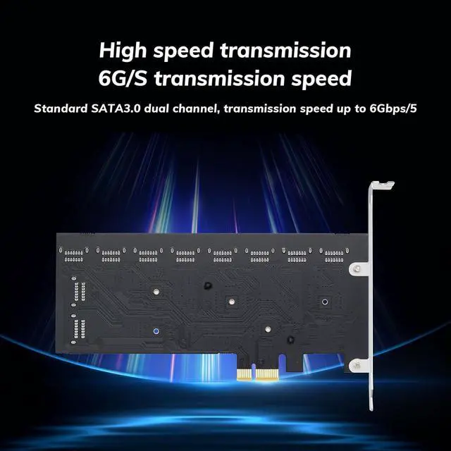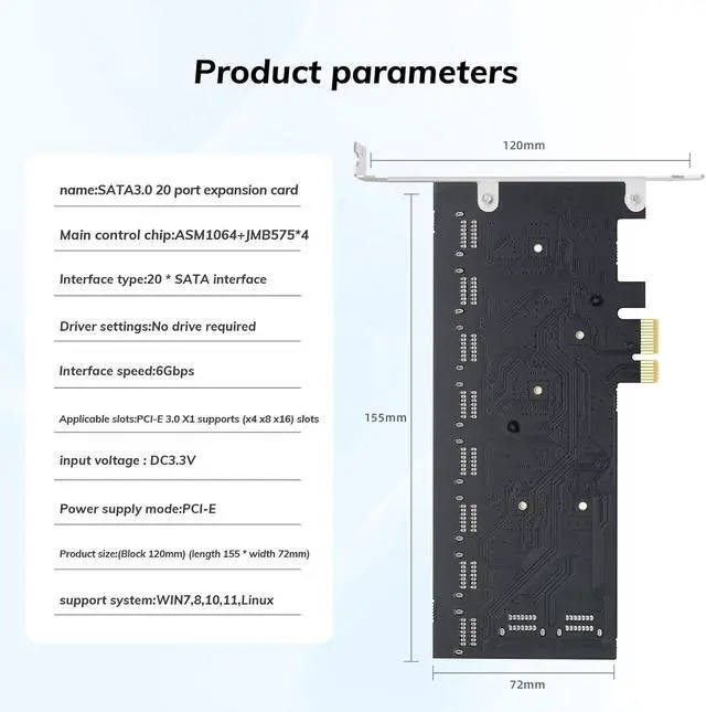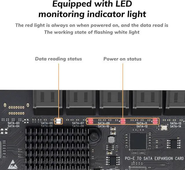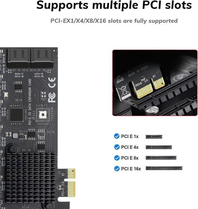 "Advanced Compatibility", Works with PCIe x4, x8, or x16 slots (auto-negotiation) and supports both 3.3V/5V SATA power, ensuring broad compatibility with desktops, NAS, or RAID systems.