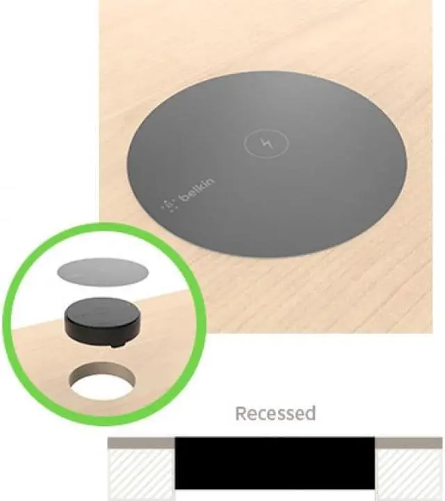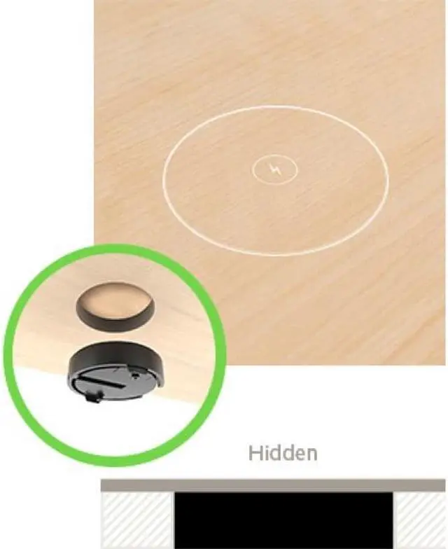 With hidden installation, the wireless charging pad is installed beneath a desk or table for minimal impact, and charges through non-metallic thin laminate or veneer materials. Installation is easy thanks to commonly available stock or drilled hole dimensions, although professional installation is recommended. A separate window/table sticker is included to inform customers that wireless charging is available here.