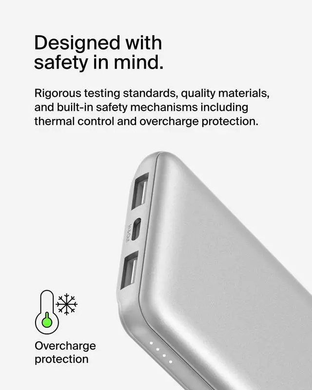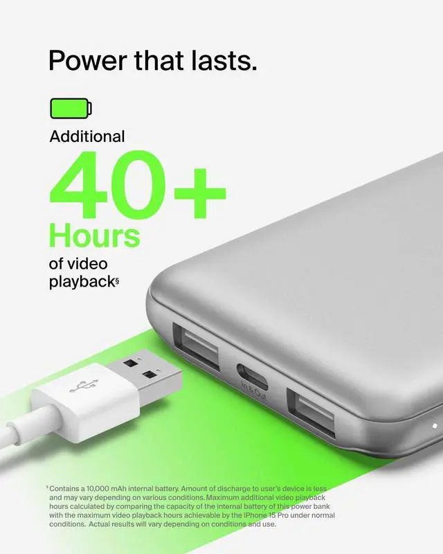 Charge 3 devices at once with a 10K portable charger that's as versatile as it is convenient. Two USB-A ports and one USB-C port provide up to 15W of power at once for your smart phone and two other devices. An included USB-A to USB-C cable lets you start charging right away.