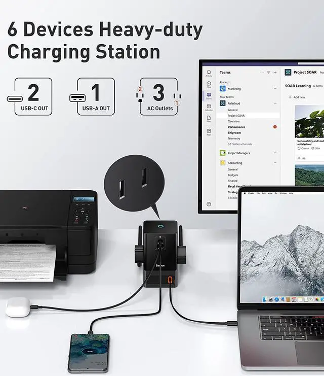 USB Charging Station: 3 AC outlets, 1 USB-C, 1 USB-A port, and built-in retractable Type-C cable to charge and power up to 6 devices at a time