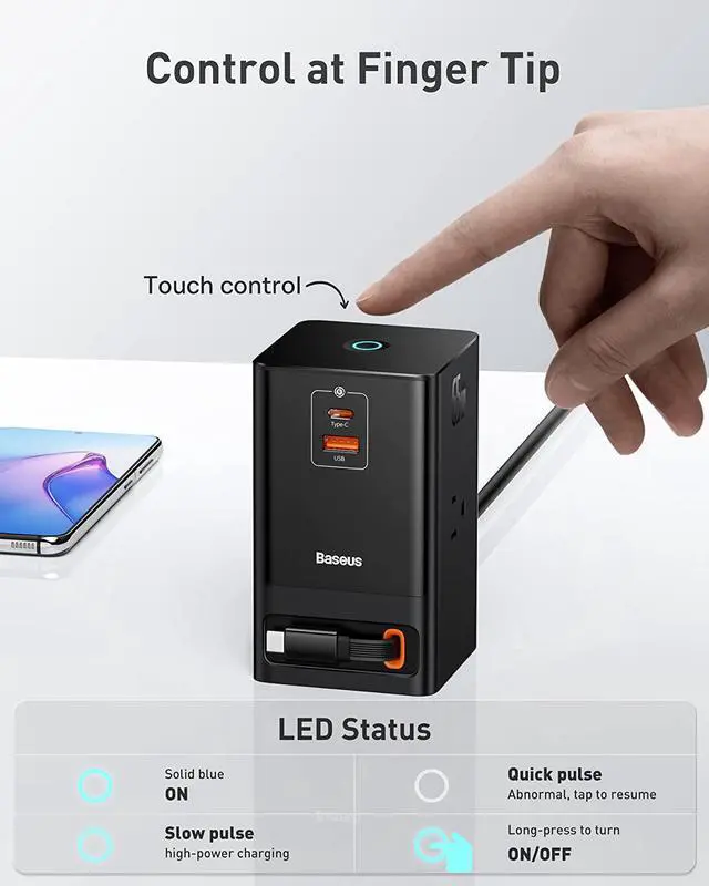Control at Finger Tip: This outlet extender has a power button with ice blue halo light to switch ON the outlets when needed and OFF when finished with a simple tap; 3 pulsing mode indicating status for your safety