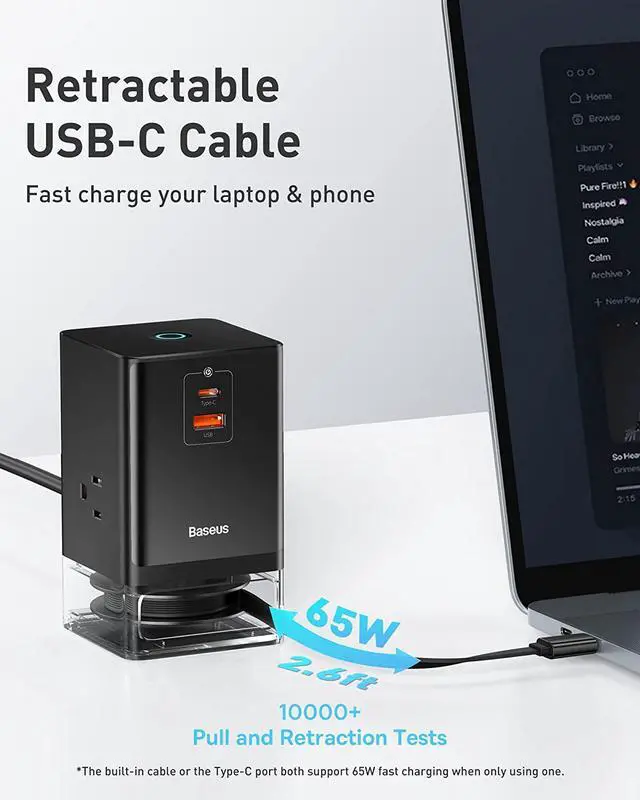 Built-in 65W Retractable Cable: Reach and pull to charge all your USB-C device at 65W max, and pull again to send it back keeping your working space clutter-free; max output 65W using the Type-C port as well