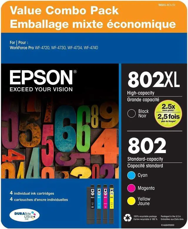 Epson 802 Black High Capacity and Color Standard Capacity Ink Cartridges C/M/Y/K 4-Pack Replace only the cartridge that runs out with individual ink cartridges Best of all, only one set of cartridges is needed to print amazing documents and great photos