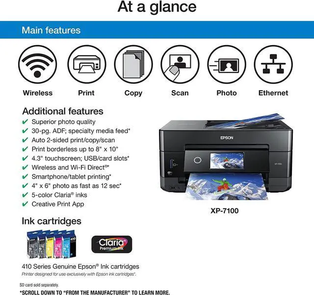 Product 1: This printer is designed for use with epson cartridges only, not third party cartridges or ink; cartridges described as compatible, re manufactured, refilled or refillable may not work properly or at all; see product description for more details