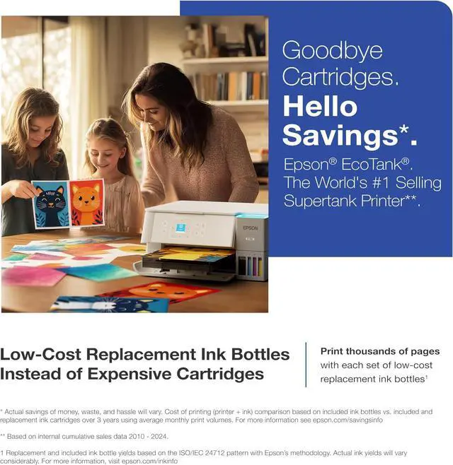 INCREDIBLE VALUE Epson EcoTank includes enough ink to last up to 3 years. And if you run low, youll save up to 90% with replacement ink bottles vs. ink cartridges