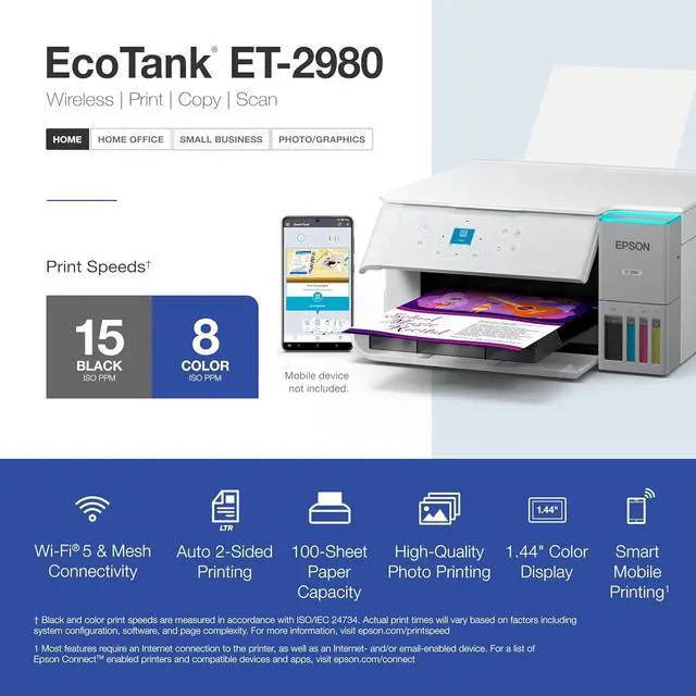 WIRELESS MOBILE PRINTING Print and scan from the convenience of your smart device with enhanced mobile printing from the Epson Smart Panel app; supports Apple AirPrint