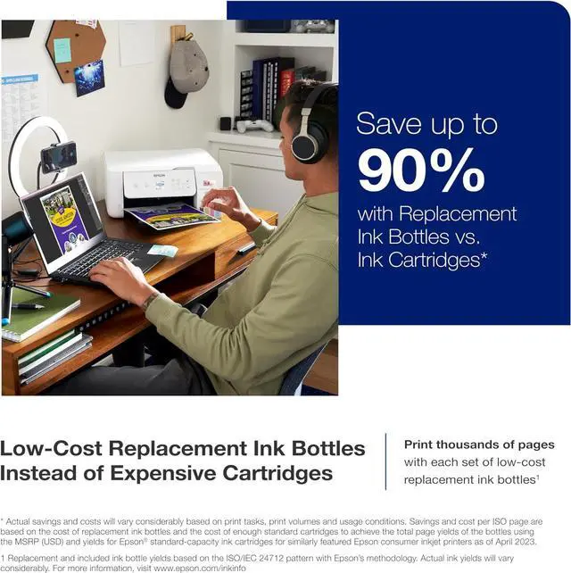Dramatic Savings on Replacement Ink Save up to 90% with replacement ink bottles vs. ink cartridges (1) thats enough to print up to 4,500 pages black/7,500 colour (3)