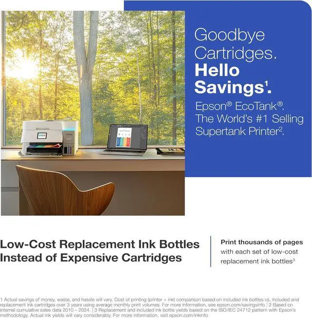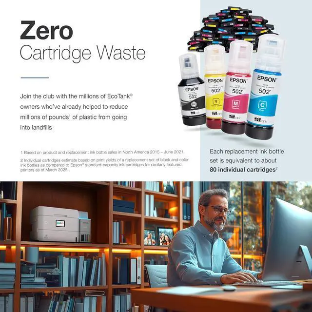 INCREDIBLE VALUE Epson EcoTank includes enough ink to last up to 3 years. And if you run low, youll save up to 90% with replacement ink bottles vs. ink cartridges
