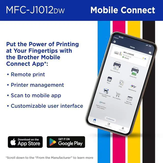 Easy-to-use 1.8 colour display. Easily navigate onscreen menus that include powerful features. Go mobile with the simple-to-use Brother Mobile Connect app that delivers easy onscreen menu navigation for printing, copying, scanning, and device management from your mobile device.