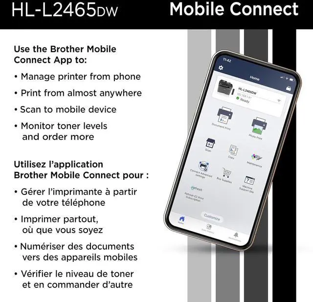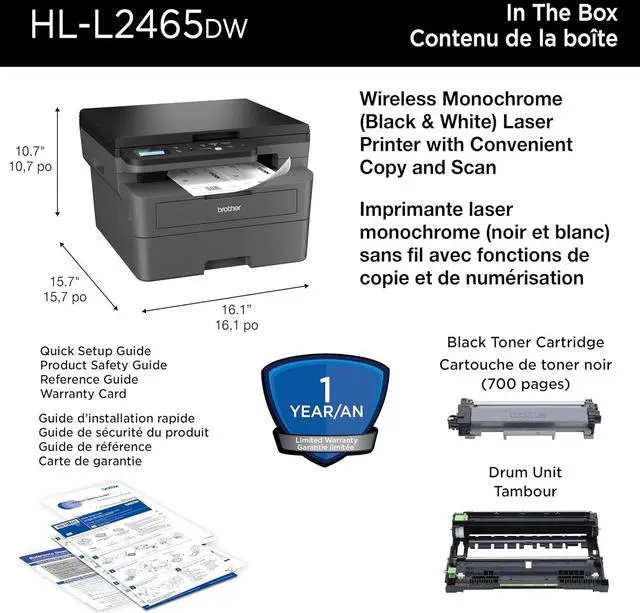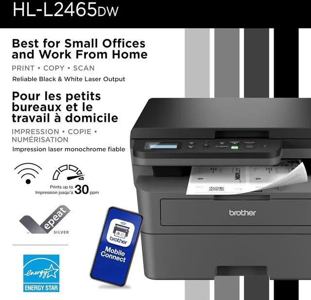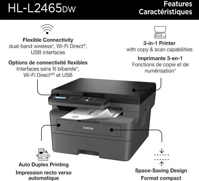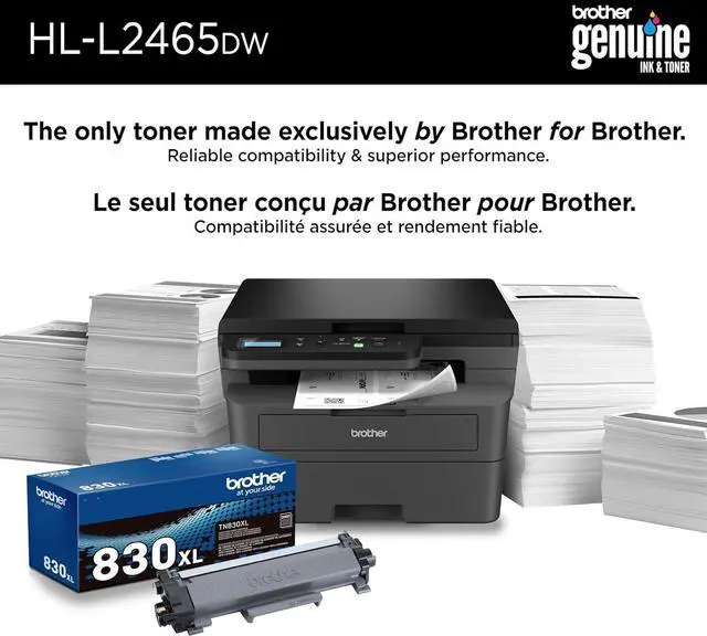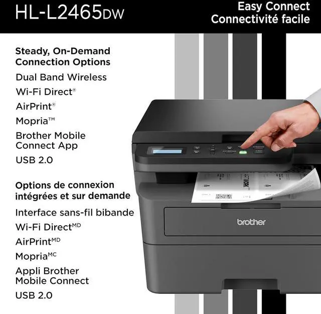 Efficient black & white print, copy, and scan functions. Engineered for consistent, premium print quality. Print confidently with Brother Genuine black toner. Fast print speeds for increased efficiency. Wireless, Ethernet or USB connectivity options.