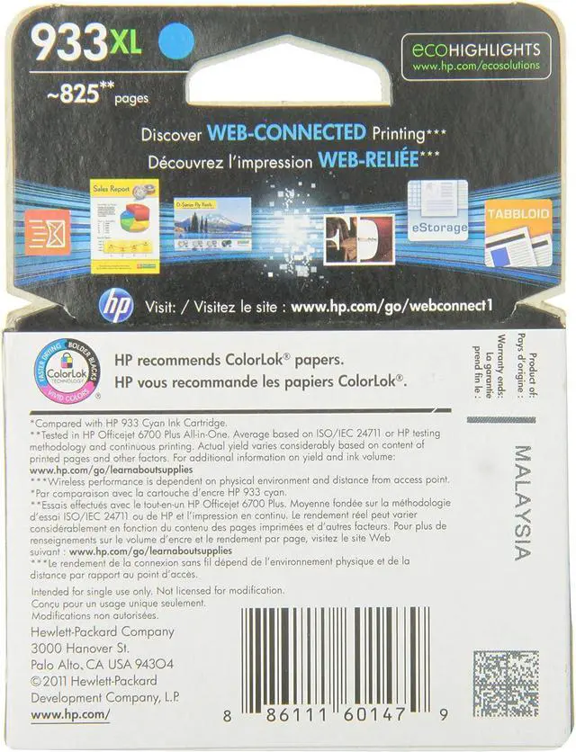 What's in the box: New Original HP 933XL Cyan High Yield Original Ink Cartridge (CN054AN)