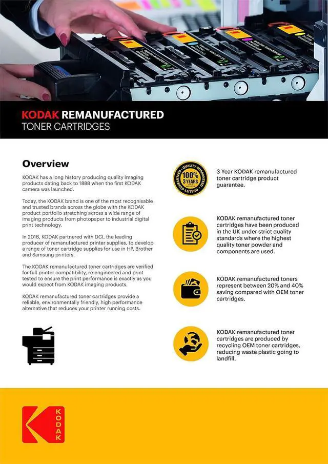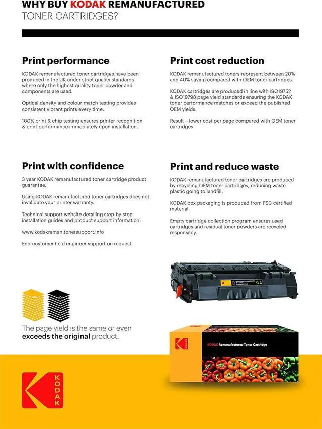 REMANUFACTURED CARTRIDGE: This cartridge has been remanufactured by Kodak. Printer compatibility guaranteed.