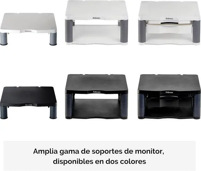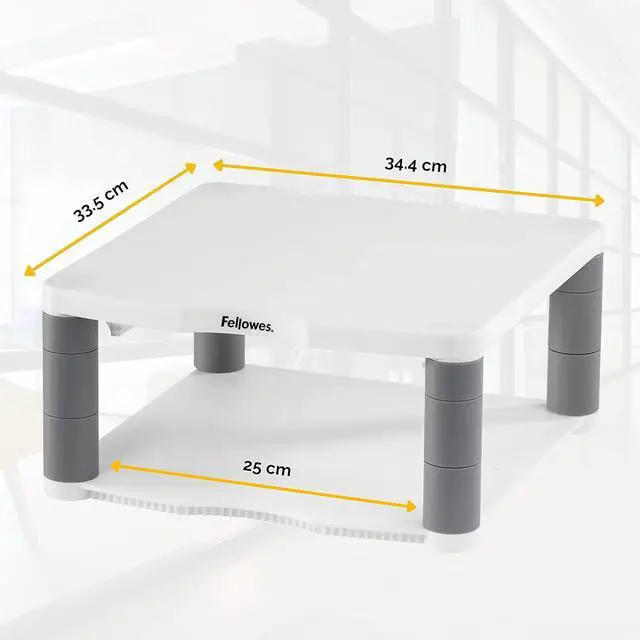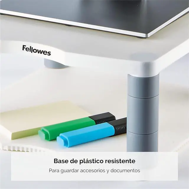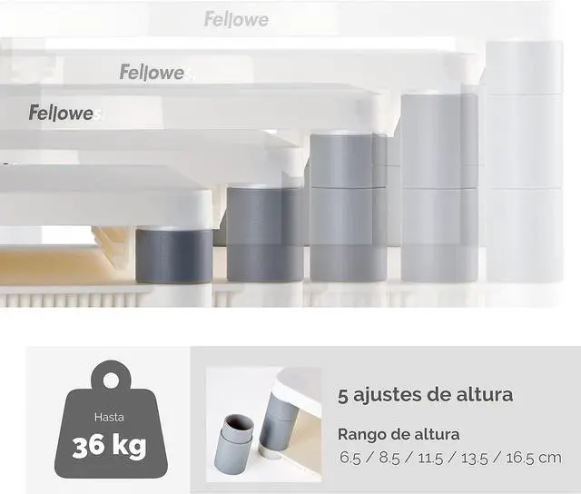 Adjustable to 5 different heights with innovative stacking columns Space beneath platform can be used for storage Capable of holding up to 80lbs.(36 kg) Cable/power cord guides allow for proper cable routing Can sit on the desktop or on top of the CPU