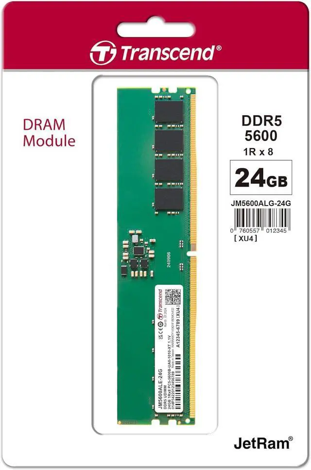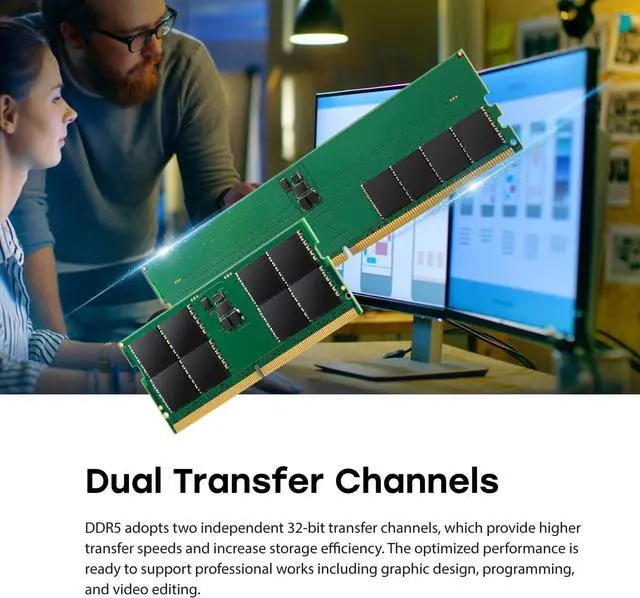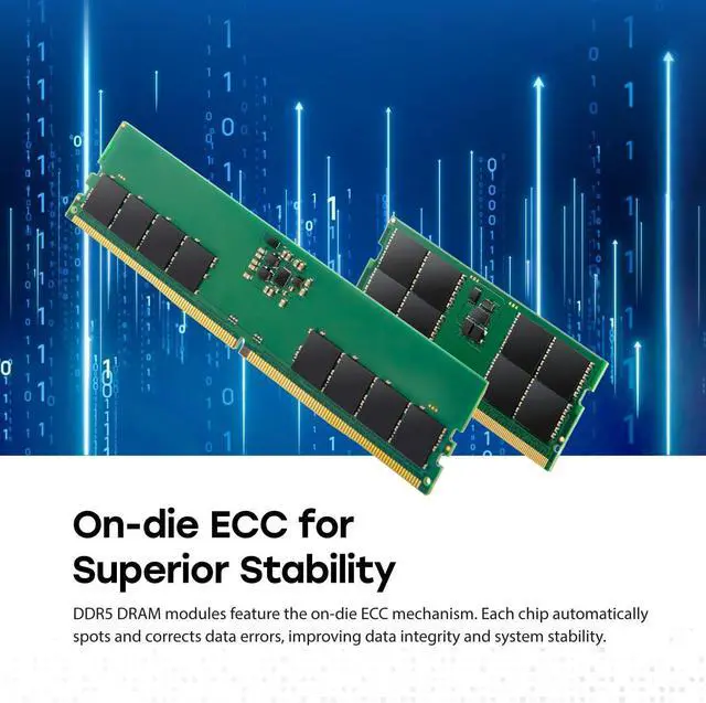 Compliant with JEDEC international standards, Transcend's DDR5 DRAM modules come with high-quality chips and key components. Quality is guaranteed with rigorous reliability tests. DDR5 features two independent 32-bit channels that bring speeds to 5,600 MT/s. 1.1V low working voltage and PMIC effectively reduce signal interruption while cutting down power consumption for your computer. On-die ECC automatically spots and corrects data errors, enhancing data integrity and system stability.