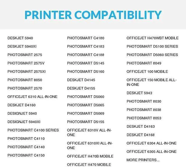 Compatible Printers: HP DesignJet 5940 5940xi | DeskJet: 5940 5940xi 5943 D4145 D4155 D4160 D4163 D4168 | OfficeJet: 100 150 6304 6305 6307 6308 6310 6310v 6310xi 6313 6315 6318 H470 H470b H470wbt
