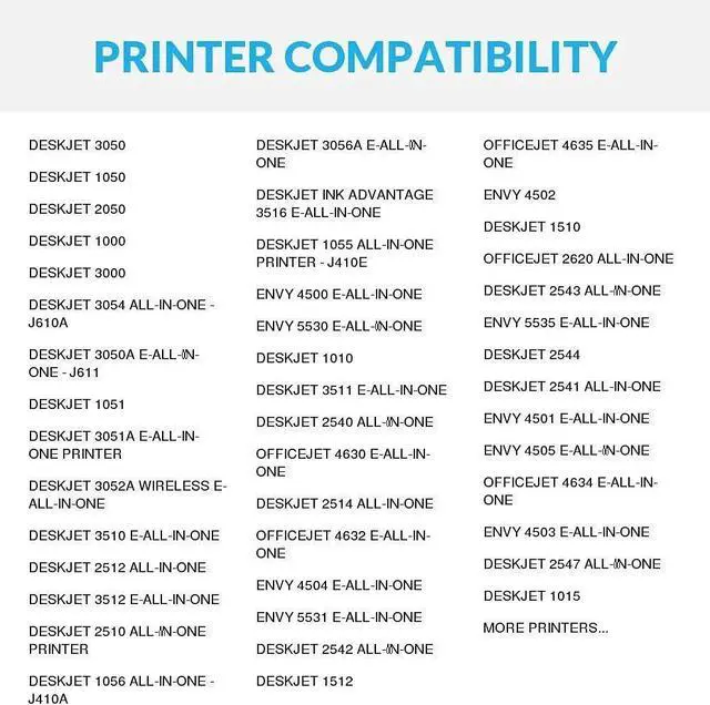 Compatible with: HP: Deskjet 1000, Deskjet 1010, Deskjet 1050, Deskjet 1051, Deskjet 1055, Deskjet 1056, Deskjet 1510, Deskjet 1512, Deskjet 2050, Deskjet 2510, Deskjet 2512, Deskjet 2514, Deskjet 2540 , Deskjet 3054,