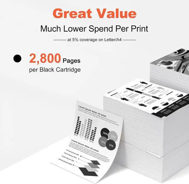 Print more and cost less: 2,800 Pages per Black cartridge at 5% coverage (Letter/A4)