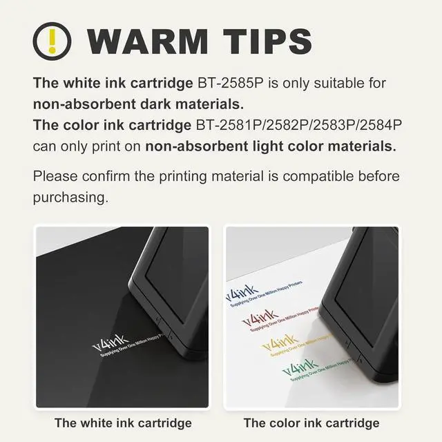 Ink Compatibility: v4ink Bentsai BT-2583P yellow ink cartridge is built with self-developed encrypted chip and can only be used on v4ink Bentsai BT-HH6105B2, BT-HH6105B3 handheld printer gun, and B10 mini handheld printer.