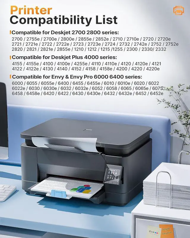 Printer Compatibility: Compatible for HP DeskJet 1255, 2710e, 2720e, 2721e, 2722, 2722e, 2723e, 2724, 2725, 2732, 2742e, 2752e, 2755, 2755e, 4110e, 4120e, 4121e, 4122e, 4123e, 4130e, 4132e, 4133e, 4152e, 4155e, 4158e; DeskJet Plus 4122, 4132, 4155; ENVY 6010e, 6020e, 6022e, 6030e, 6032e, 6034e, 6050e, 6052e, 6055, 6055e, 6075, 6075e, 6420e, 6422e, 6430e, 6432e, 6450e, 6452e, 6455e, 6458e, 6475e; ENVY Pro 6455, 6458, 6475 Printers