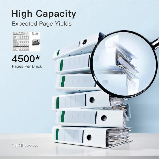 Page Yield: Black is 4500 pages per cartridge at 5% coverage