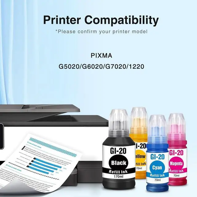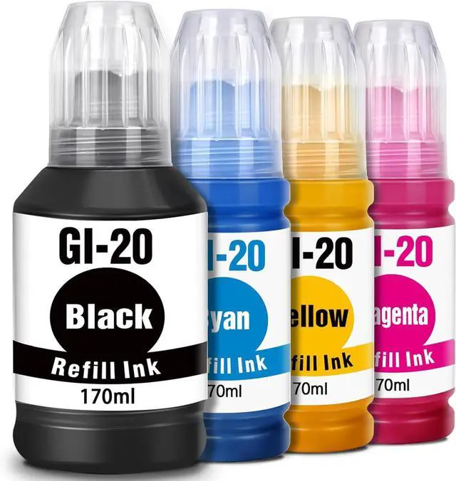 Persistent Printing : Ours GI-20 ink refill set includes 170ml GI-20 black ink refill bottle, 70ml GI20 cyan ink refill bottle, 70ml GI20 magenta ink refill bottle, 70ml GI-20 yellow ink refill bottle. These GI-20 ink bottle replacement for canon GI-20 GI20 ink refill bottle set are high-page-yield. 6000 pages for each GI-20 black ink bottle7000 pages for each GI-20 color ink bottle(at 5% coverage of A4 paper).