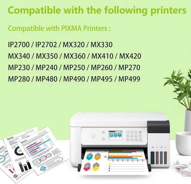 • Compatible for Canon PIXMA Printers: IP2702 IP2700; MX320 MX330 MX340 MX350 MX360 MX410 MX420; MP230 MP240 MP250 MP260 MP270 MP280 MP480 MP490 MP495 MP499.