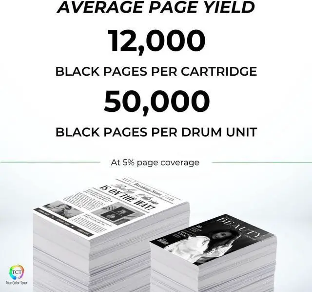Page Yield: Up to 12000 pages per cartridge and 50000 pages per drum unit at 5% coverage (Letter/A4).