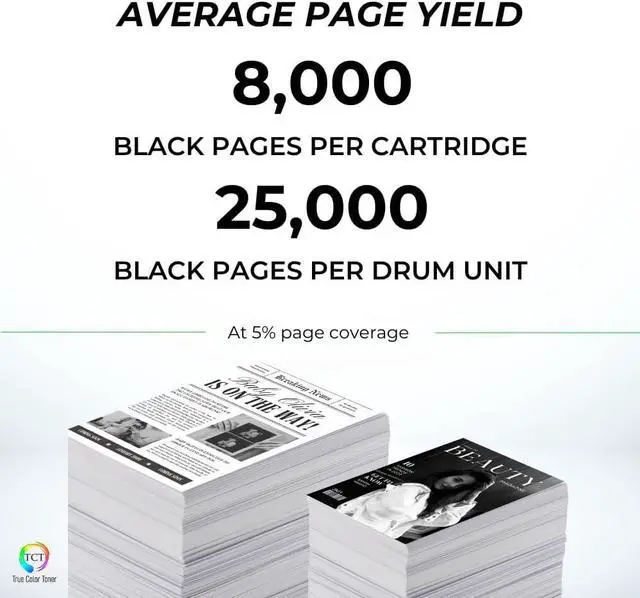 Page Yield: Up to 8000 pages per cartridge and 25000 pages per drum unit at 5% coverage (Letter/A4).