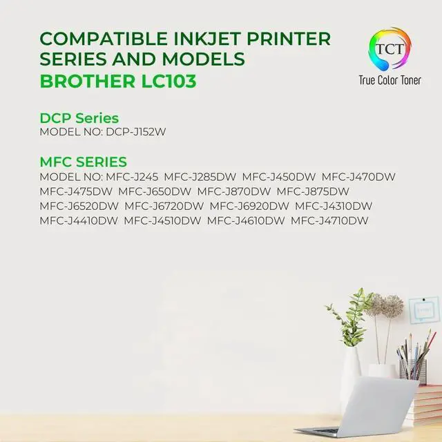 SEAMLESS CARTRIDGE COMPATIBILITY. These TCT Ink cartridges are Compatible with the following Printers: Brother DCP-J152W MFC-J245 MFC-J285DW MFC-J4310DW MFC-J4410DW MFC-J450DW MFC-J4510DW MFC-J4610DW MFC-J470DW MFC-J4710DW MFC-J475DW MFC-J650DW MFC-J6520DW MFC-J6720DW MFC-J6920DW MFC-J870DW MFC-J875DW