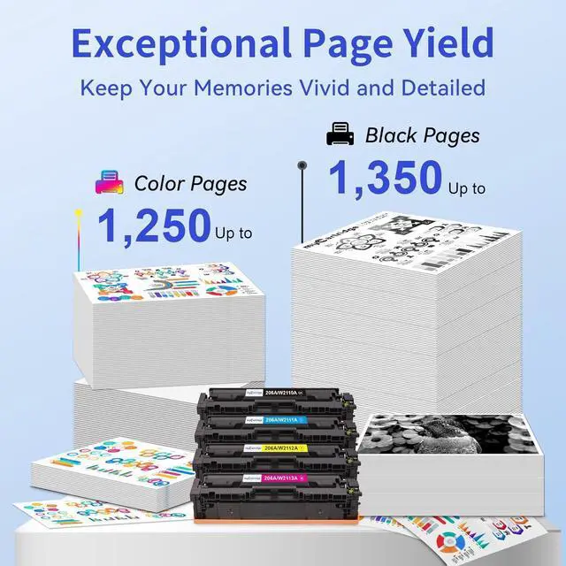 • With Chip: Experience seamless compatibility with HP 206A Toner Cartridges 4 Pack. Our cartridges feature built-in chips, eliminating the need to transfer old ones