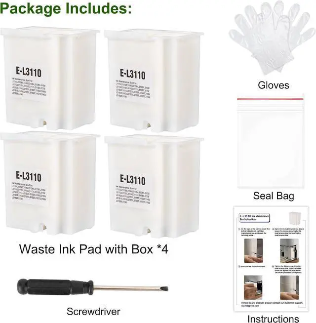2.Package included 4x Replacement maintenance Tank(Ink Pad Sponge Included), 1x dual-head screwdriver, 1x seal bag, 1x tweezers, 2x disposible gloves, 1x Instructions.