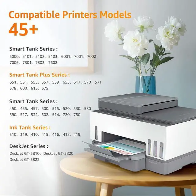Works seamlessly with HP Smart Tank printers 7001 7002 7005 7006 7301 7302 7300 7306 6001 6000 6002 6100 7602 7606 5101 5100 5102 5000 5103 450 455 457 517 532 502 514 530 515 550 559 580 590 617 655 720 , HP Smart Tank Plus 551 516 555 570 651 659. HP DeskJet Series 5810 5820 5822, and HP Ink Tank Series 310 319 410 415 416 418 419.