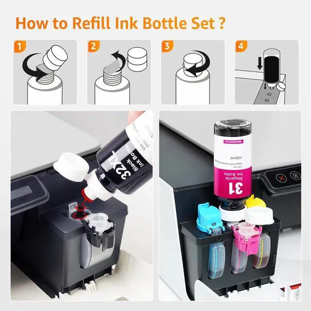 Package Included: 1x 32XL black ink bottle (165ml), 3 x 31 ink bottle set (Cyan/Magenta/Yellow, 100ml each) 1 pair of gloves and 1 bottle opener Tool.