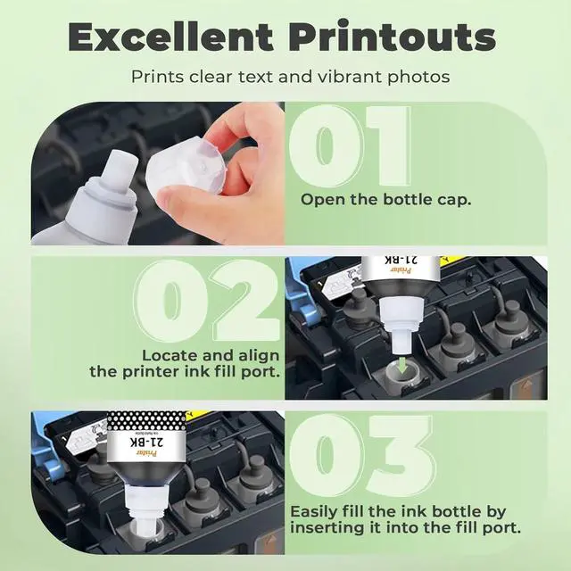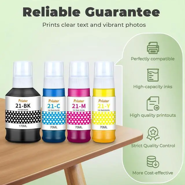 GI-21 GI21 G3260 G3290 G4280 G3270 Black Ink Refill Bottles Compatible for GI-21 GI21 Ink Refill Bottles for G3270 G3290 G4280 G3260 G4270 G2260 G1220 G1230 G2270 MegaTank Printer (2 Black GI21 Ink Bottles Set) GI-21 Ink Refill Bottles Setcompatible for GI-21 GI21 ink refill bottles, compatible for G3270 ink refill bottles, compatible for PIXMA Megatank G3270 refill bottles, compatible for G3260 ink refill bottles, compatible for Megatank G3290 ink refill bottles, compatible for G4280 ink refill bottles, compatible for MegaTank G3270 G3260 G3290 G4280 G2260 G1220 G1230 G2270 G4270 ink refill bottles. Perfectly Compatible Printer: GI-21 Ink Refill Bottles Set Compatible for PIXMA MegaTank G3270 G3260 G3290 G4280 G4270 G2260 G1220 G1230 G2270 Printer. Package Includes: 2 Packs Compatible for GI-21 GI21 Ink Refill Bottles.(2 x Black GI 21 Ink Refill Bottle 170 ml) Super-High Page Yield: Compatible for GI-21 Black Ink Bottle Up to 9,500 pages (At 5% coverage). Outstanding raw materials, after the most stringent quality testing, GI-21 ink bottles smooth and uniform, no clogging, no fading, to ensure that the print out of smooth and neat text and vivid color photos. Easy to install, good penetration and strong adhesion.