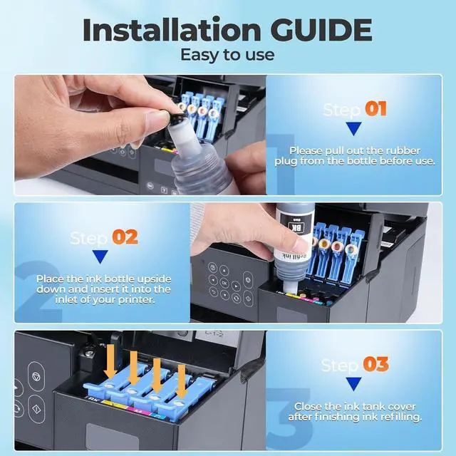 High Capacity for 522 Ink Refill Bottles Compatible with: et-2800 ink, et-2400 ink, et-4800 ink, et-2803 ink, et-2840 ink, et-2720 ink, et-4700 ink, et-4810 ink, 522 ink refill for ecotank et-2803 ink refill, ecotank et-2400 ink refill, ecotank et-4800 ink refill, ecotank et-2800 ink refill, ecotank et-2720 ink refill, ecotank et-4700 ink refill, ecotank et-4800 ink refill, 2800 ink, 2400 ink, 2803 ink, 4800 ink, 2840 ink, 2720 ink, 4700 ink, 4810 ink, et2800 ink, et2400 ink, et4800 ink, et2803 ink, et2840 ink, et2720 ink, et4700 ink, et4810 ink. High Capacity for 522 Ink Compatible with: 522 ink refill bottles for et-4800 ink refill, et-2400 ink refill, et-2803 ink refill, et-2800 ink refill, et-2840 ink refill, et-2720 ink refill, et-4700 ink refill, et-4810 ink refill, 2400 ink refill, 2800 ink refill, 2803 ink refill, 2840 ink refill, 4800 ink refill, 2720 ink refill, 4700 ink refill, 4810 ink refill, et2400 et4800 et2800 et2803 et2840 et2720 et4700 ink et4810, for eco tank 2800, eco tank 2400, eco tank 4800, eco tank 2720, eco tank 4700, eco tank 4810, eco tank 2840, eco tank 2803 Printer. [Not Sublimation Ink] for 522 Ink Refill Page Yield : Up to 8000 Pages per T522 522 black ink, 8000 Pages per T522 522 ink bottle color combo pack, 5% coverage at A4 paper. Our 522 ink refill bottles has auto-stop nozzle design, easy filling, no spills, no drip, no need to squzze the ink bottles! Say goodbye to the hassle of manually squeezing and potentially spilling ink. Sharp Text & Vibrant black: These 522 ink bottles has ink that allows you to print whatever you need, including documents, reports, letters, photos, graphics and much more.
