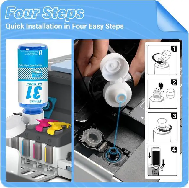 Anti-leak design: Inkgens 31 32xl ink refill bottle adopts automatic stop design to prevent ink spillage, and no need to squeeze to refill. It can easily fill your eco-friendly ink cartridge printer, and the performance is comparable to the original ink bottle.